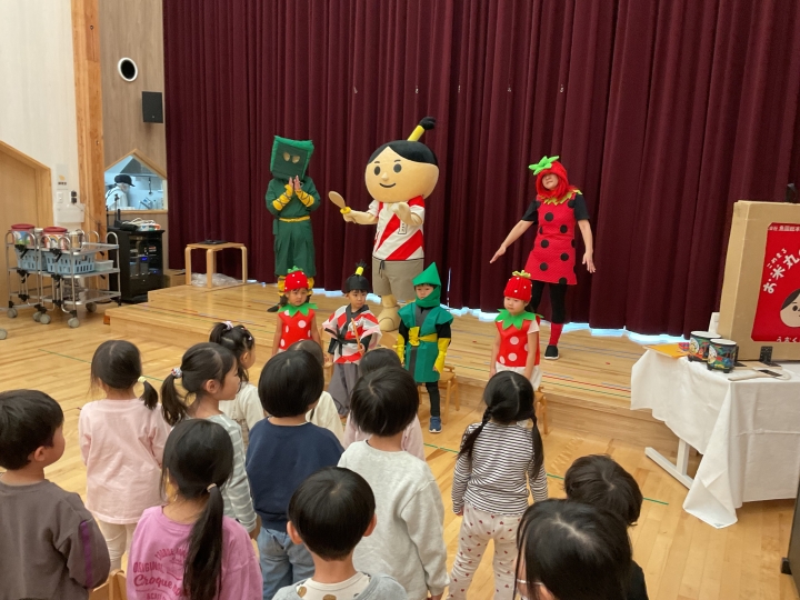 食育キャラクターのお米丸・いちご姫・食いしん坊忍者が来園しました。