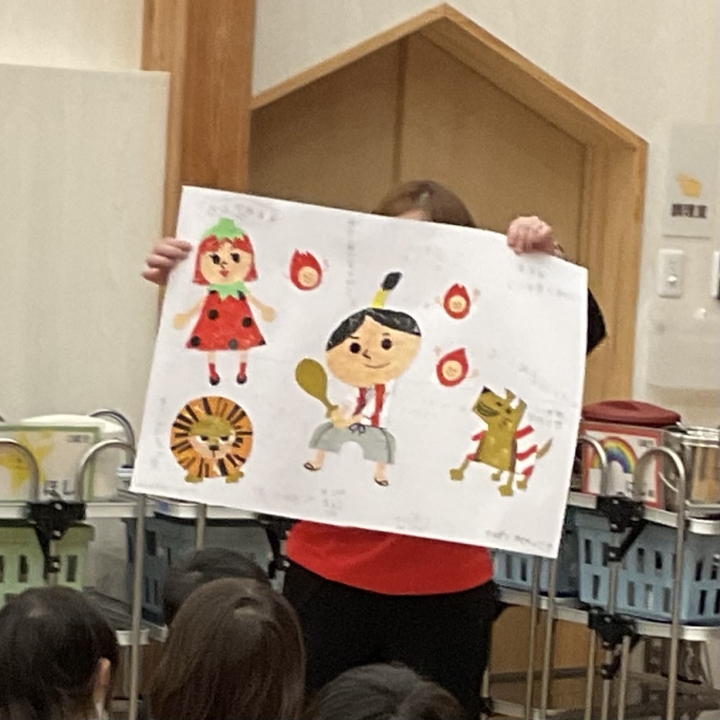 子どもたちはキャラクターたちと一緒に、「お米」の大切さや、毎日の献立を考えてくださる調理の先生方への